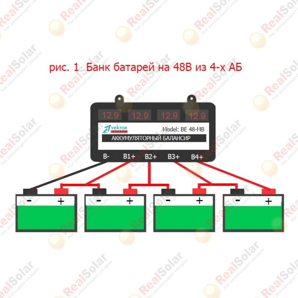 Схема подключения к четырем последовательно соединенным 12В батареям