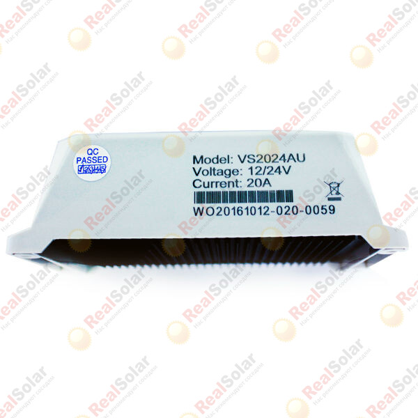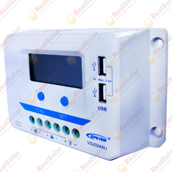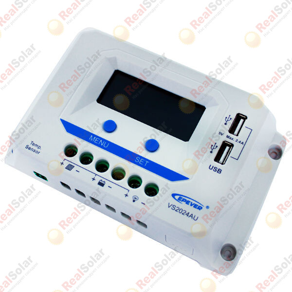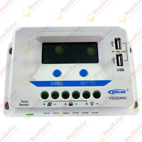 Надежный и практичный контроллер заряда Epsolar VS2024AU 20А 12/24В применяется для заряда свинцово-кислотных аккумуляторов напряжением 12В или 24В. Используется с солнечными панелями суммарной мощностью 240-480 Вт. Дополнительно оснащен двумя портами USB для подзарядки различных мобильных устройств.