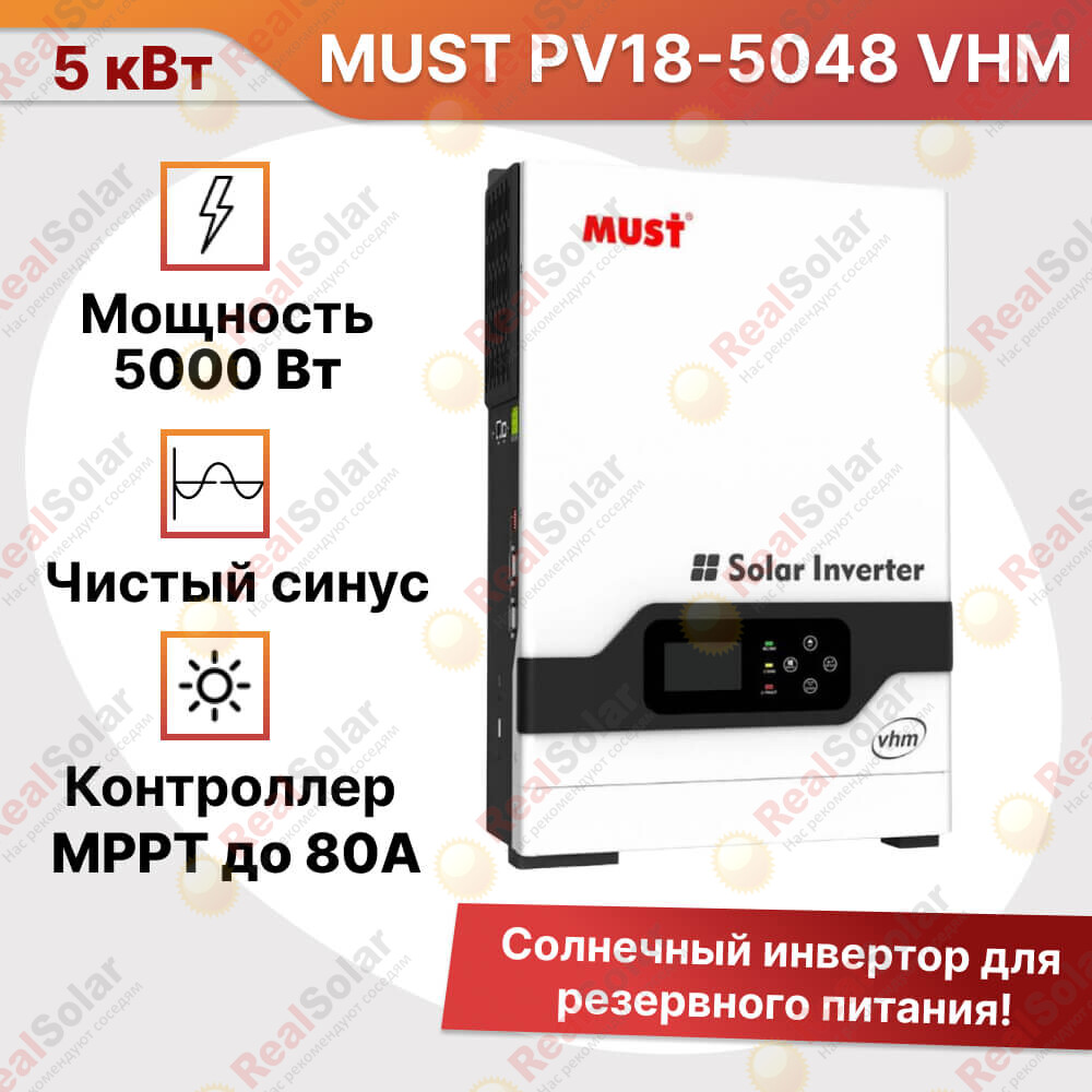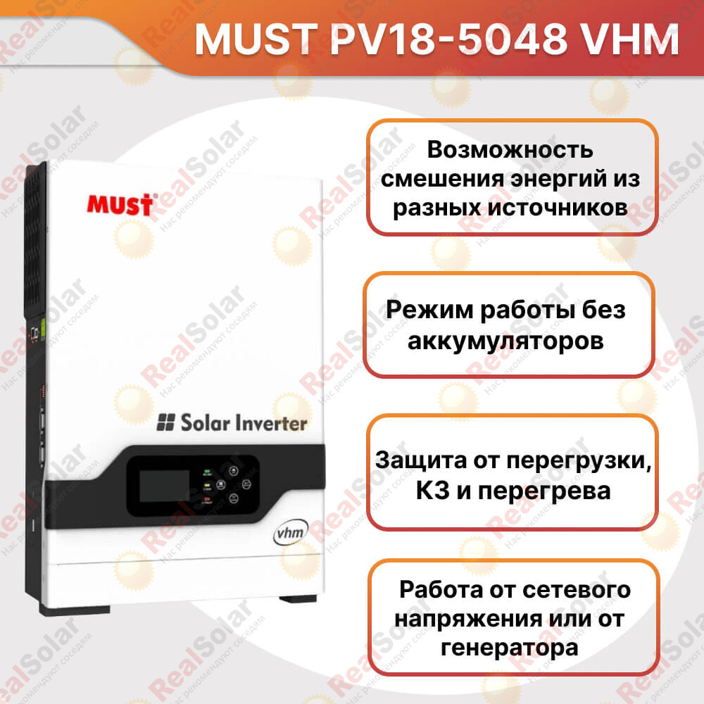Инвертор MUST PV18-5048 VHM- это гибридный инвертор предназначенный для использования в системах бесперебойного питания, с возможностью подключения солнечных панелей. Инвертор накапливает энергию от солнечных модулей в аккумуляторных батареях. Есть возможность экономии электричества при использовании солнечных панелей. Приоритеты зарядки АКБ и подачи электроэнергии потребителям задаются настройками инвертора.