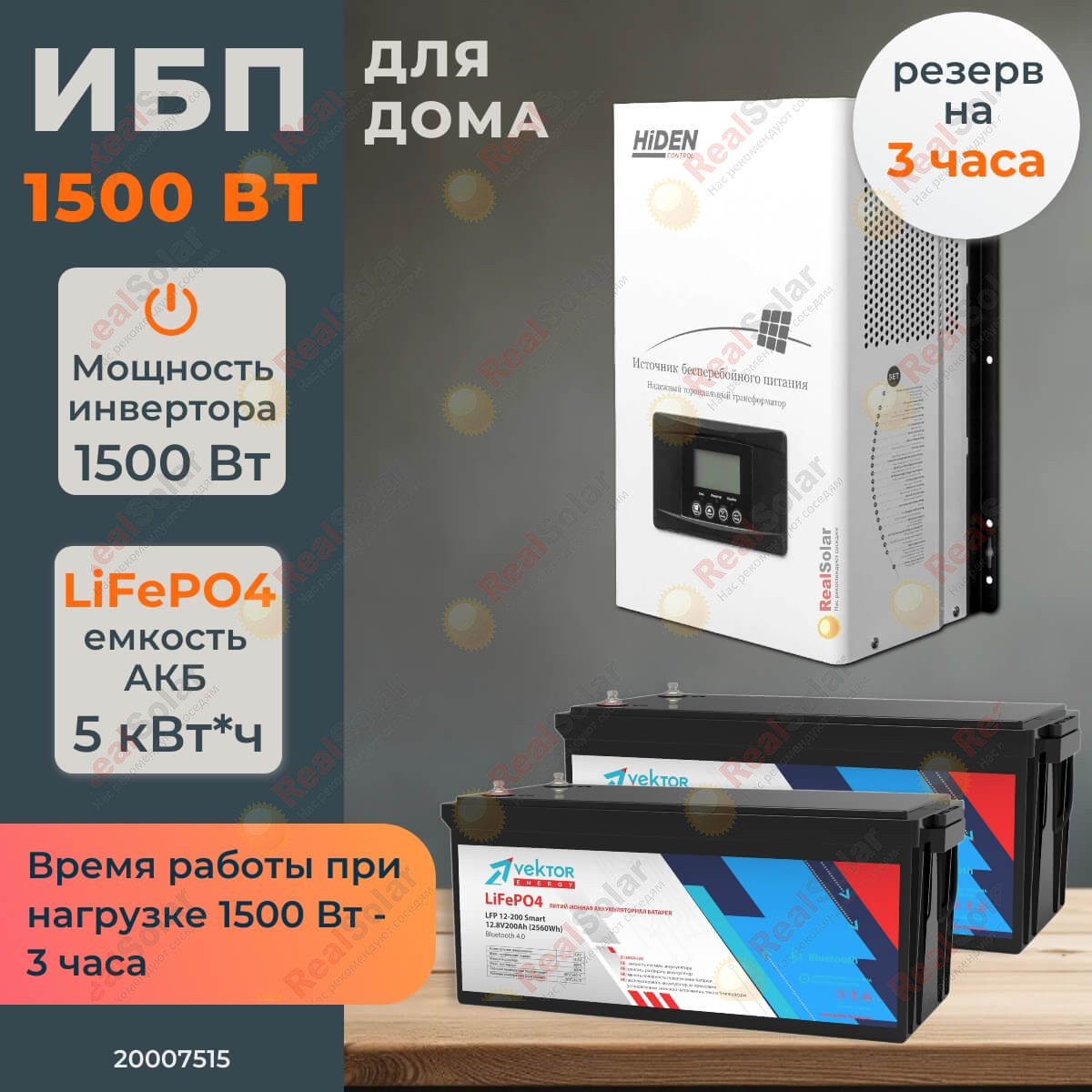 Комплект бесперебойного питания для частного дома мощностью до 1500Вт с двумя литиевыми LiFePo4 аккумуляторами по 200Ач