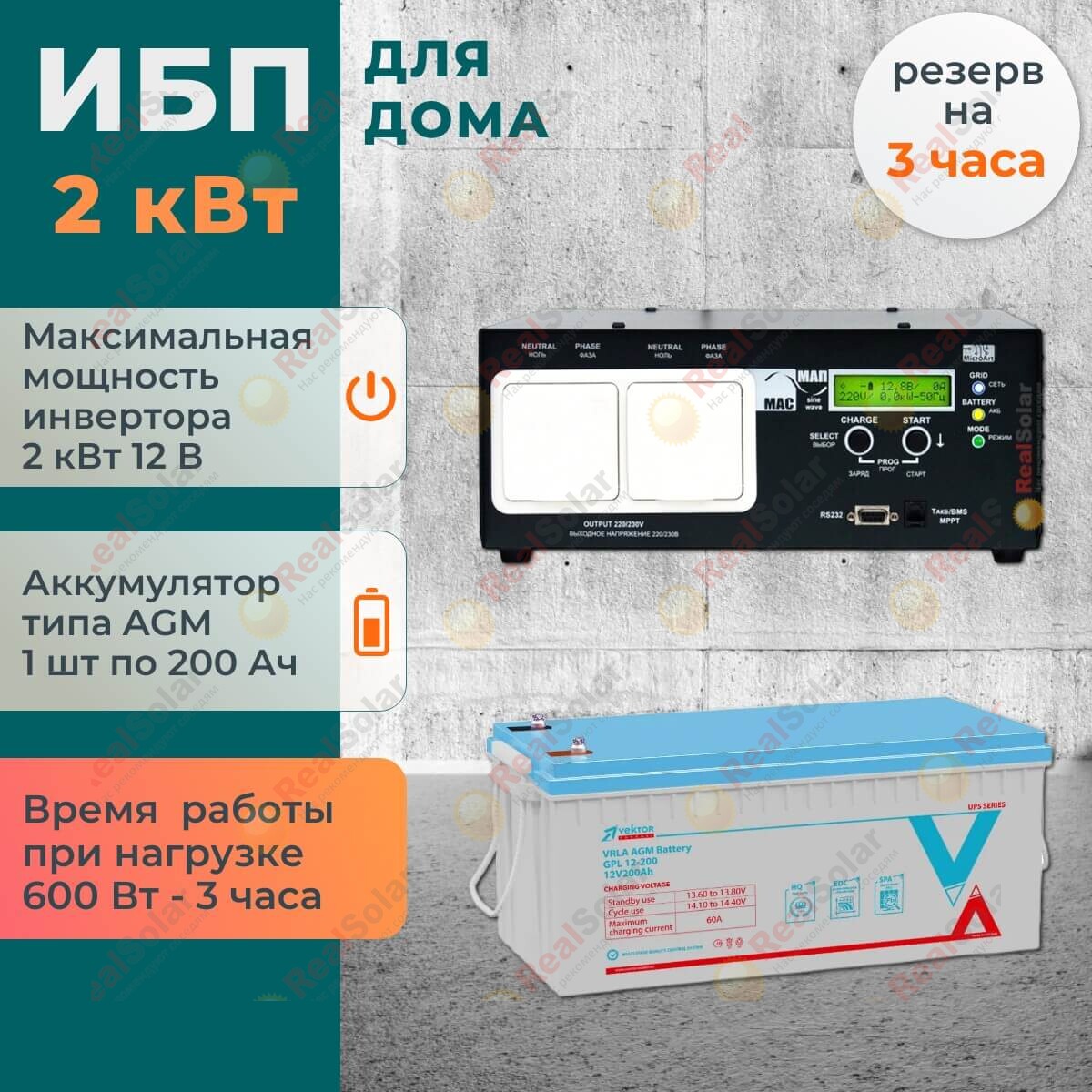Аккумулятор 200 Ач изготовленный по технологии AGM прослужит от 6 лет и более, предназначен для запасания электроэнергии и обеспечения бесперебойного питания оборудования дома при пропадании сети 220В. Время работы в автономном режиме во многом зависит от условий потребления электроэнергии, в среднем при нагрузке 2000 Вт и аккумуляторе емкостью 200 Ач ИБП сможет проработать около 1 часа.