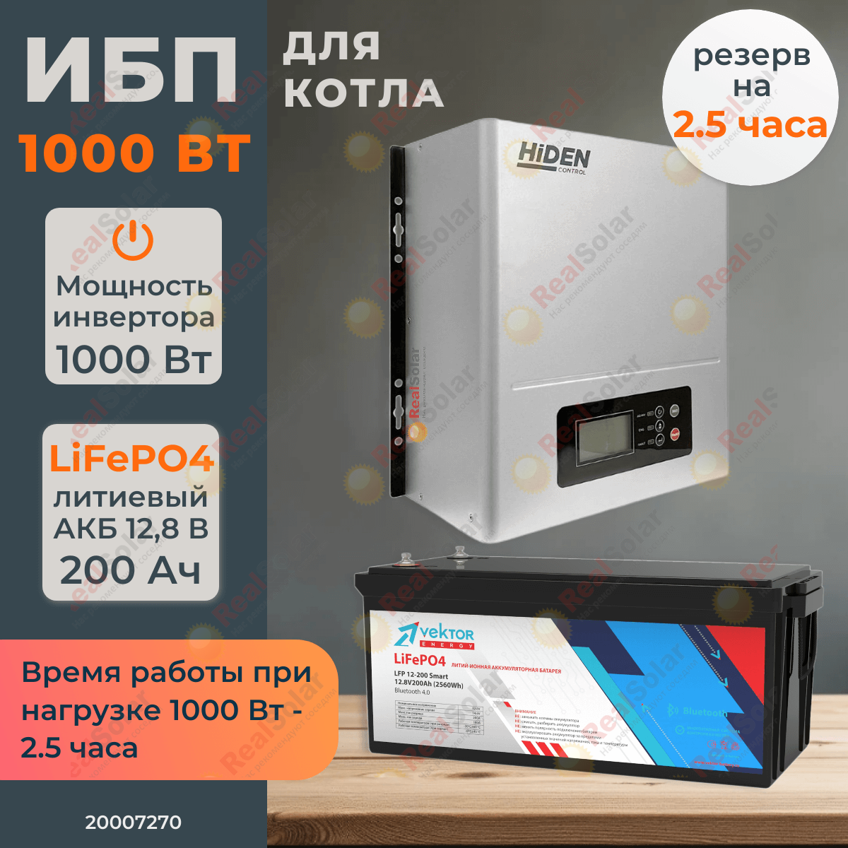 Комплект бесперебойного питания для котла мощностью до 1000 Вт с синусным инвертором илитиевым аккумулятором.
