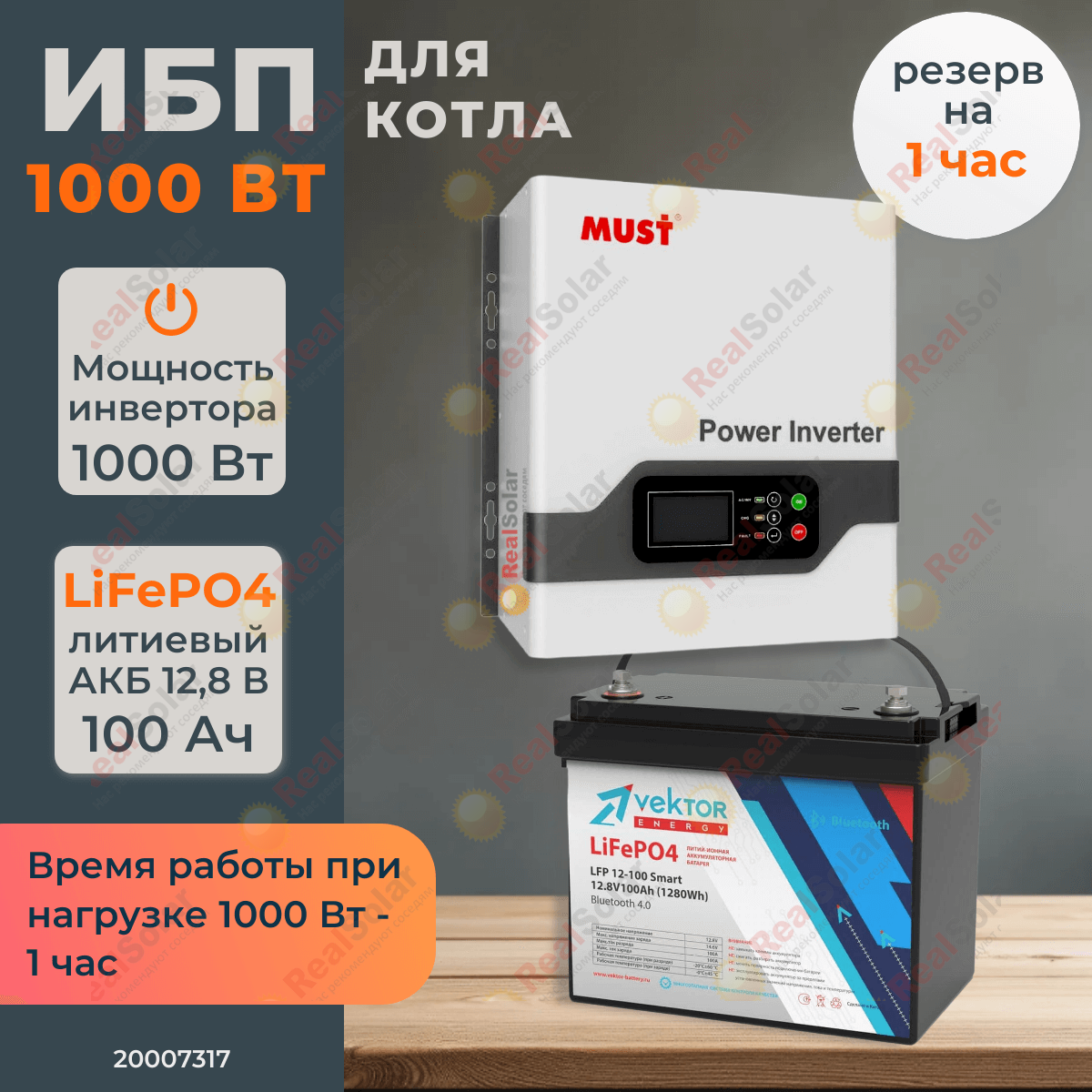 Комплект бесперебойного питания для котла мощностью до 1000 Вт с синусным инвертором илитиевым аккумулятором.