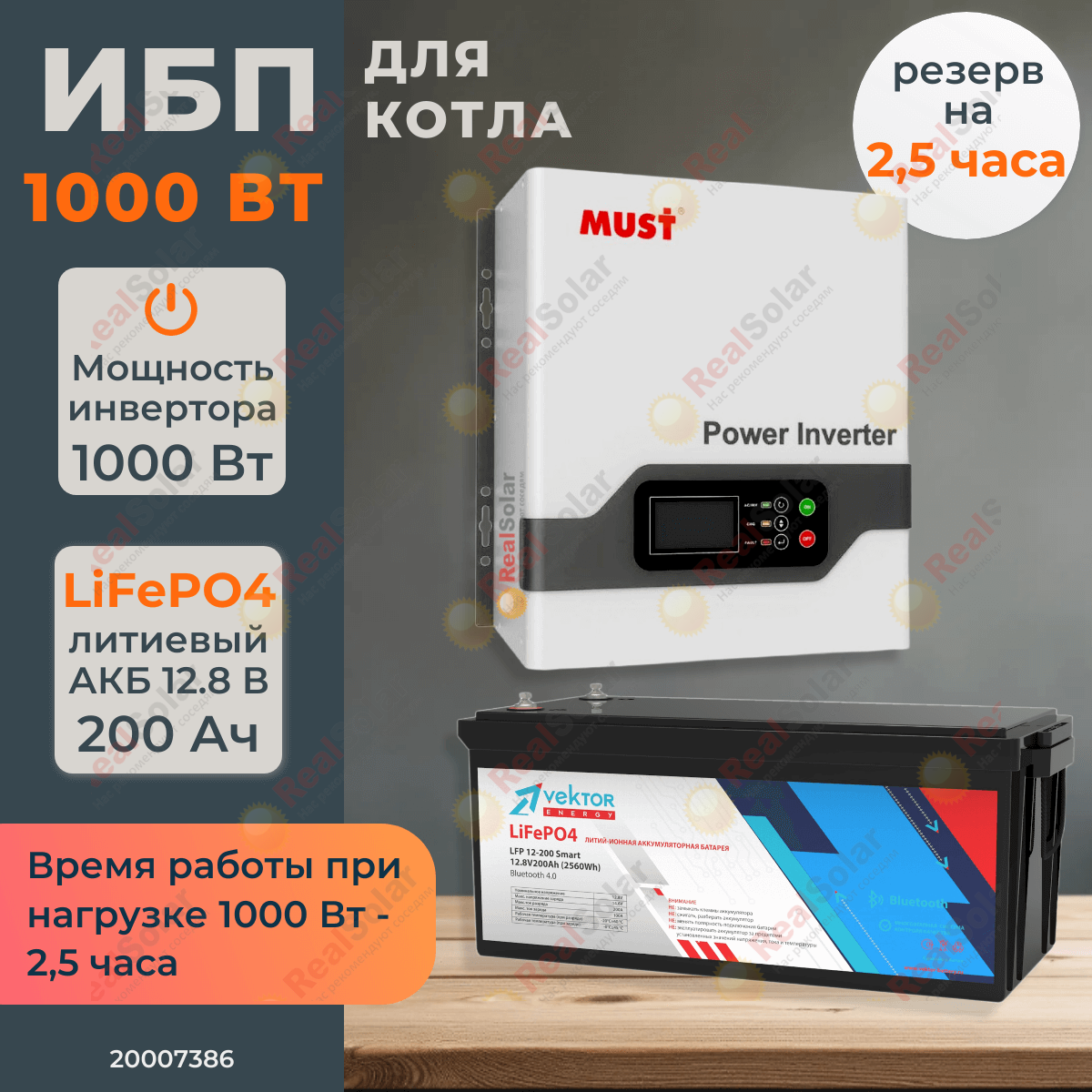 Комплект бесперебойного питания для котла мощностью до 1000 Вт с синусным инвертором илитиевым аккумулятором.
