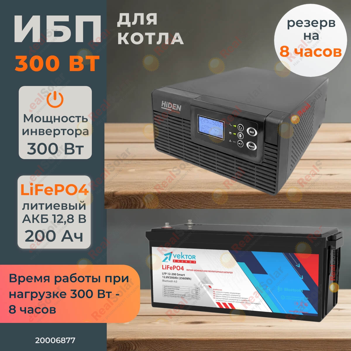 Комплект бесперебойного питания для котла мощностью до 300 Вт с синусным инвертором и литиевым аккумулятором.