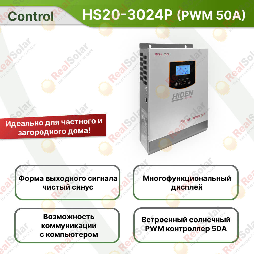 Гибридные инверторы Hiden Control HS20-3024P- могут работать как обычные автономные ИБП, но при этом имеют встроенный солнечный PWM контроллер, что позволяет существенно увеличивать время автономии за счет установки солнечных панелей.