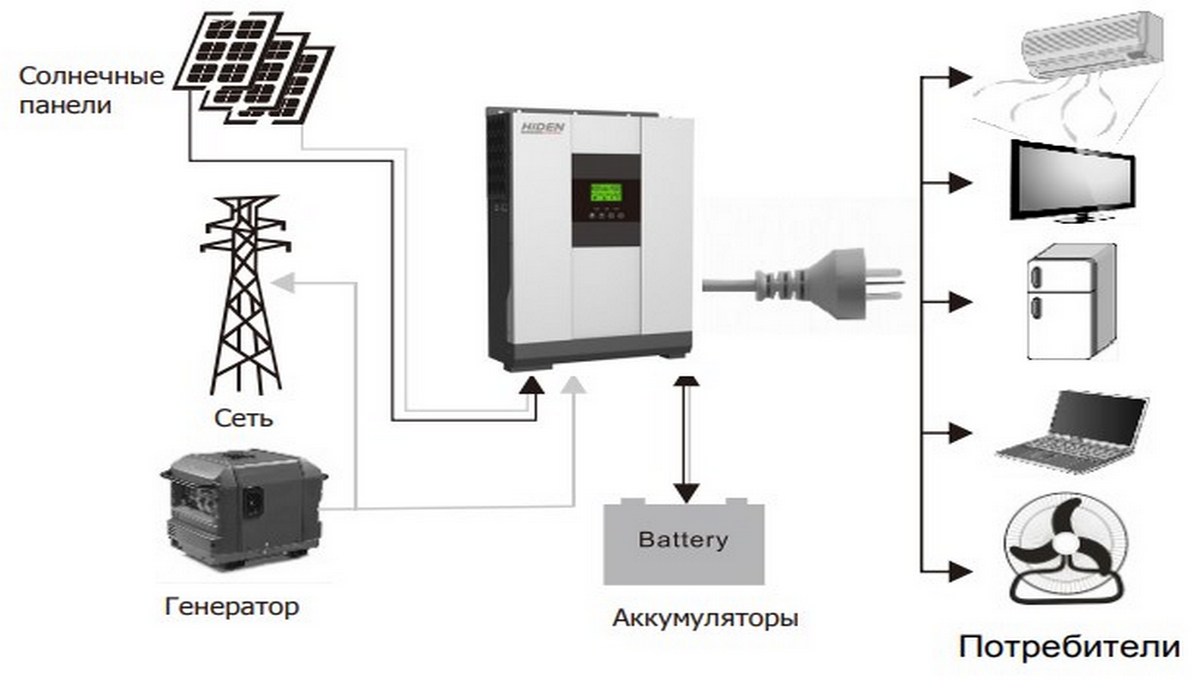 Во всех гибридных инверторах Hiden Control реализован приоритет солнечной энергии, устройство в первую очередь использует энергию солнца, и только при её нехватке будет задействовать другие источники энергии (сеть, батареи).