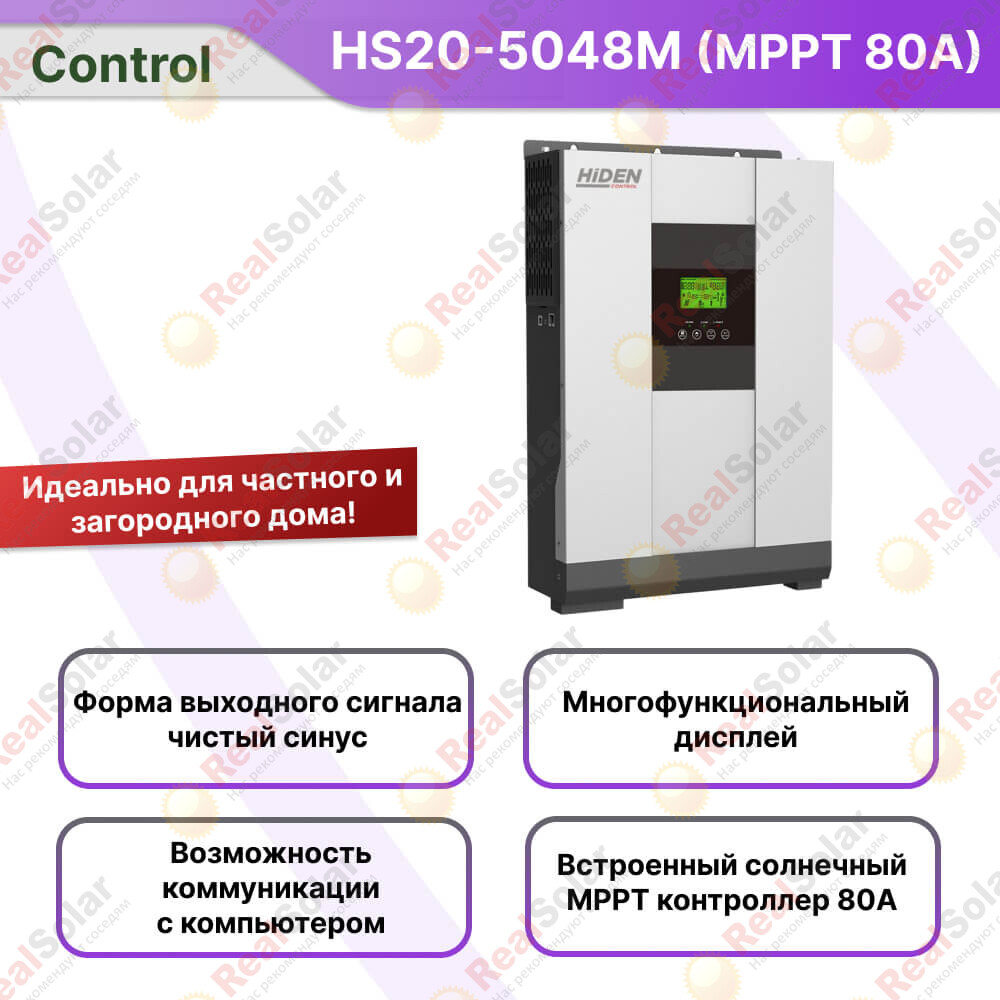 Гибридные инверторы Hiden Control HS20-5048M - могут работать как обычные автономные ИБП, но при этом имеют встроенный солнечный MPPT контроллер, что позволяет существенно увеличивать время автономии за счет установки солнечных панелей. Данный инвертор имеет функцию подмешивания и продажи солнечной энергии в сеть.