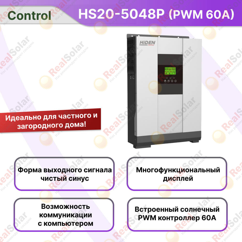 Гибридные инверторы Hiden Control HS20-5048P могут работать как обычные автономные ИБП, но при этом имеют встроенный солнечный PWM контроллер, что позволяет существенно увеличивать время автономии за счет установки солнечных панелей.