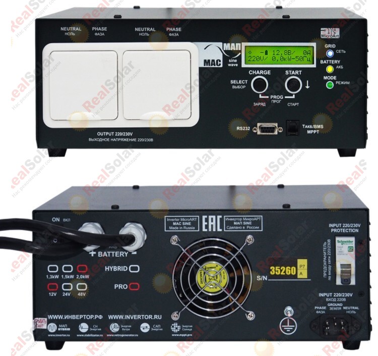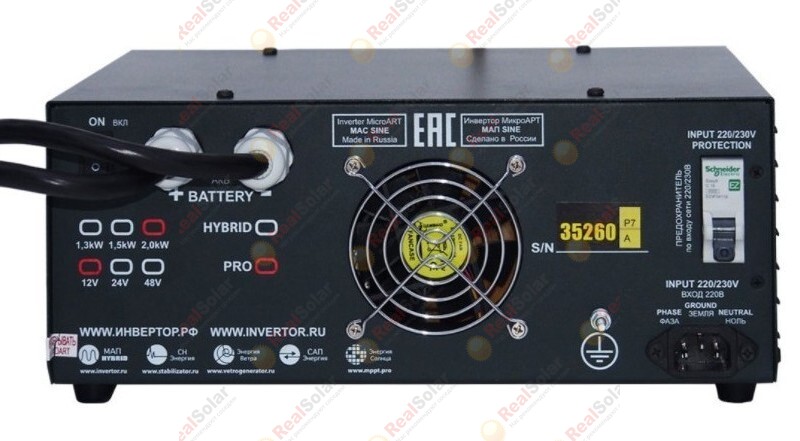 Инвертор МАП выполнен по низкочастотной технологии, как лучшие европейские инверторы. За счет такого технологического решения обеспечивается надежность и большие пусковые мощности, а также достигается минимизация электромагнитного излучения. Этим объясняется его большой вес, а также немного большая стоимость по сравнению с китайскими высокочастотными инверторами.