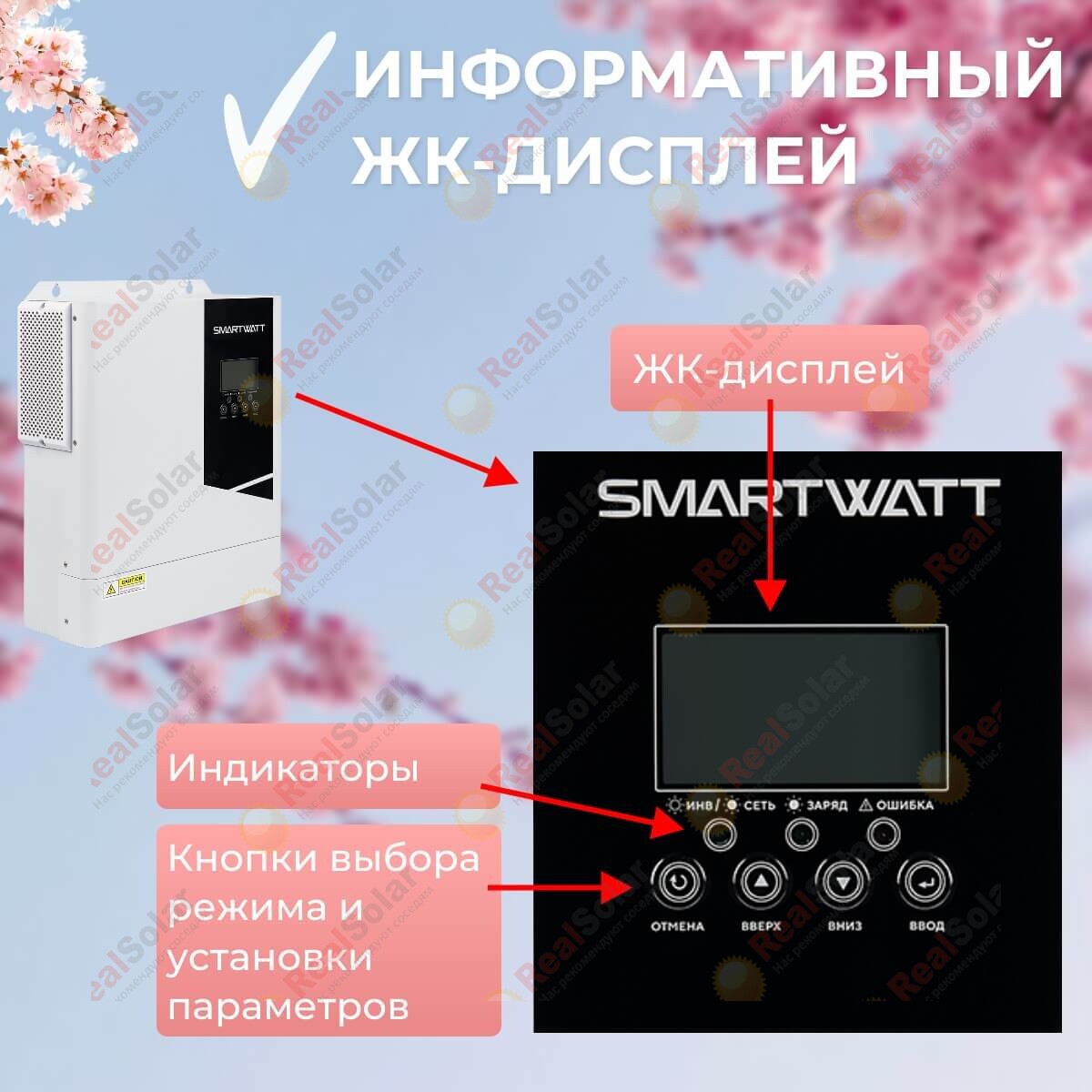 Имеет встроенный AC автомат, а также защиту от перегрузки, короткого замыкания, перегрева. Позволяет настраивать приоритет заряда от солнца или сети и изменять другие настройки с помощью встроенного LCD дисплея