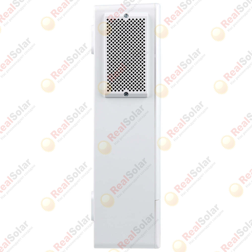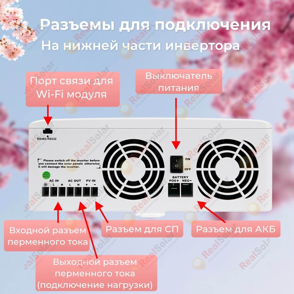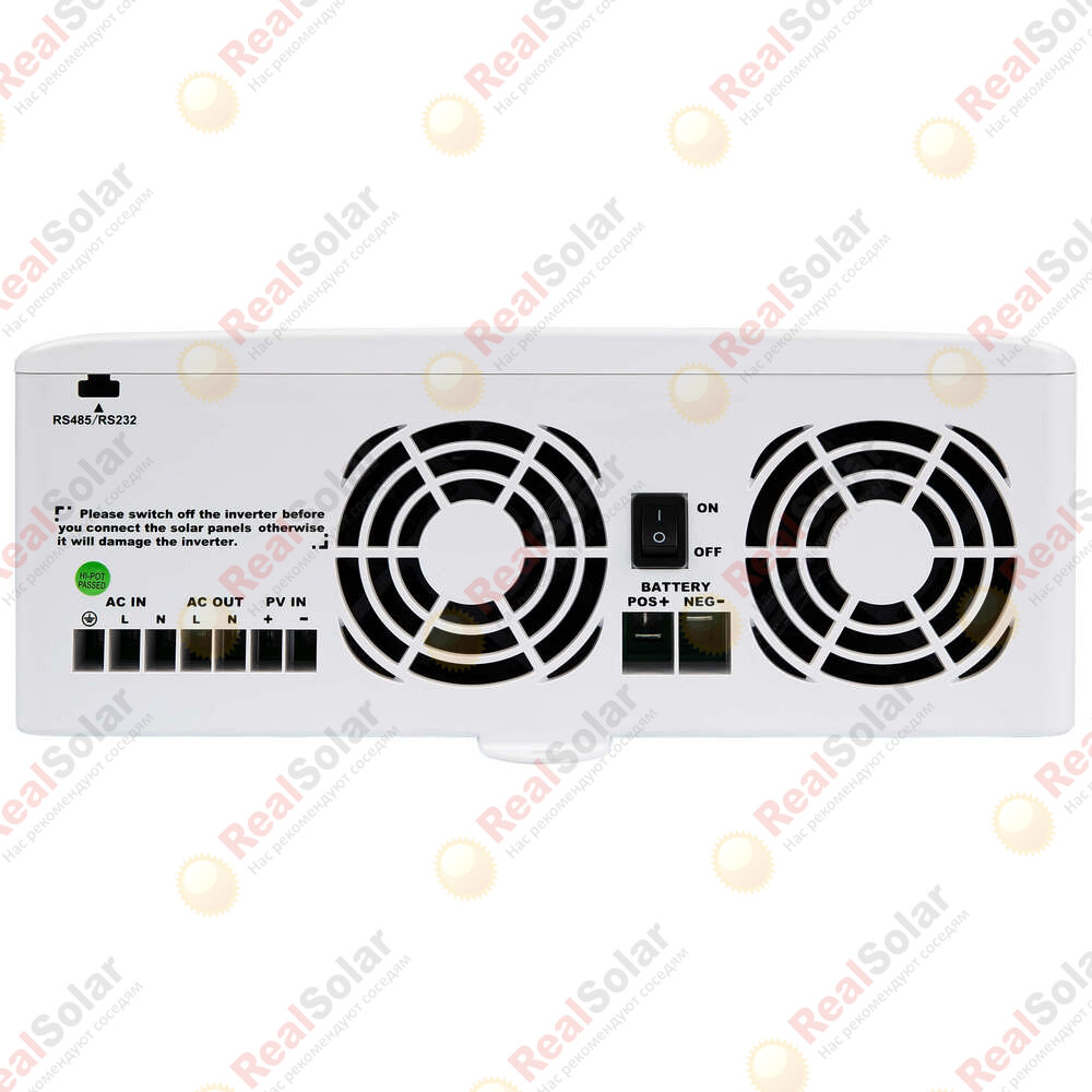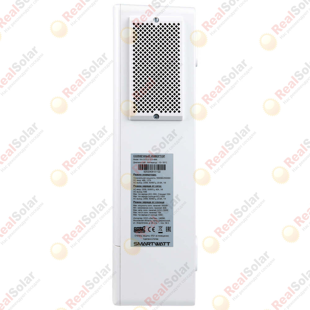 Однофазный инвертор резервного типа серии ECO II мощностью 5.5 кВт. В одном корпусе прибора одновременно работают инвертор с чистым синусом, мощное зарядное устройство от сети или генератора и контроллер заряда для солнечных панелей с током заряда до 100 ампер. Применяется для небольшой солнечной электростанции с возможностью подключения солнечных панелей до 5500 Ватт и аккумуляторов напряжением 48 Вольт. Сочетает в себе функционал инвертора и солнечного зарядного устройства с контроллером MPPT. Имеет встроенный AC автомат, а также защиту от перегрузки, короткого замыкания, перегрева. Позволяет настраивать приоритет заряда от солнца или сети и изменять другие настройки с помощью встроенного LCD дисплея