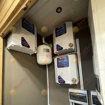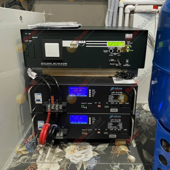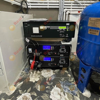 Стабилизаторы максимально компактно развесили по стенам микрокотельной, а вот для установки инветора с аккумуляторами пришлось искать место на полу, больше его разместить было просто некуда. Как всетаки удобно устанавливать литиевые аккумуляторы по сравнеинию со свинцовыми, AGM или гелевыми. Литий очень мало весит, и имеет очень маленькие размеры при огромной энергетической емкости внутри (по сравнению с классическими свинцовыми акб).