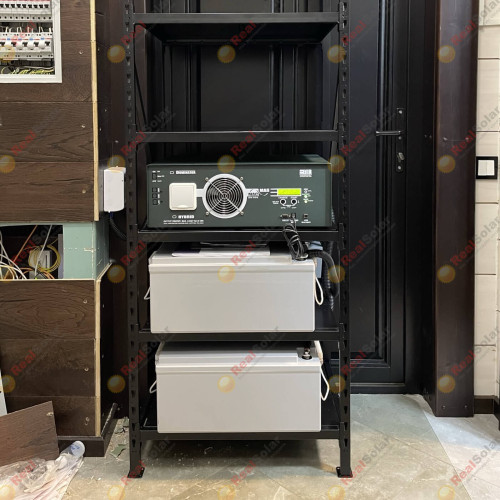 Стабилизаторы максимально компактно развесили на стене в котельной, также нами был изготовлен стеллаж для оборудования под точные размеры помещения и под заказ выкрашен в черный цвет. На стеллаже разместили 4 карбоновых аккумулятора и инвертор МАП Энергия 9 кВт.