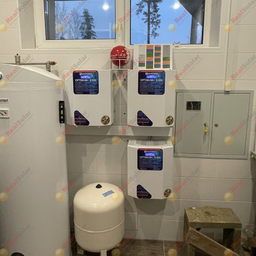 пос. Ганино. ИБП для дома МАП Dominator + 3 литиевых аккумулятора по 100Ач + 3 стабилизатора OPTIMUM+ 12000