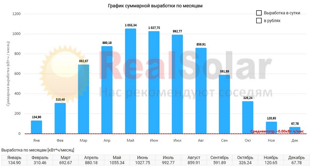 - Среднестатистическая выработка:20 кВт*ч / сутки (для г. Санкт-Петербург)