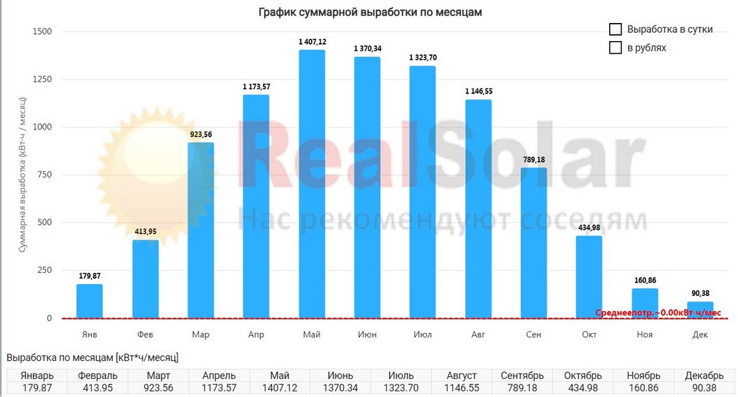 - Среднестатистическая выработка:27 кВт*ч / сутки (для г. Санкт-Петербург)