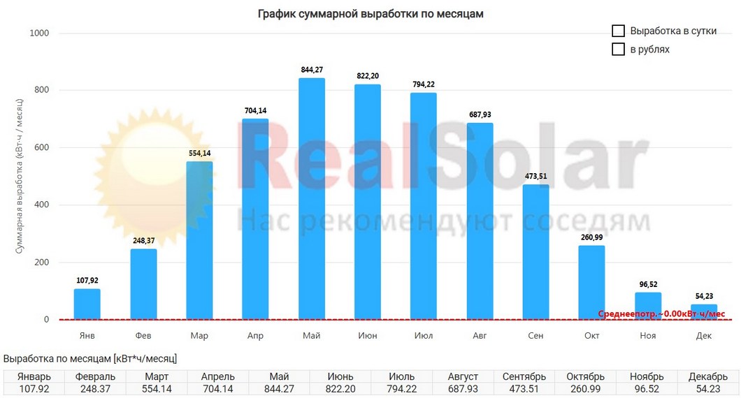 - Среднестатистическая выработка:16 кВт*ч / сутки (для г. Санкт-Петербург)