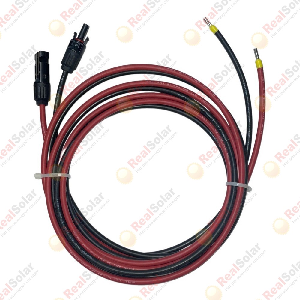 Кабель солнечный МС4 - контроллер заряда 6мм² 15 метров представляет собой комплект проводов для соединения солнечных батарей с солнечным контроллером заряда. На кабель установлены коннекторы типа MC4 (Male-Female) для подключения к солнечной батарее и наконечники типа "гильза" для подключения к контроллеру заряда.