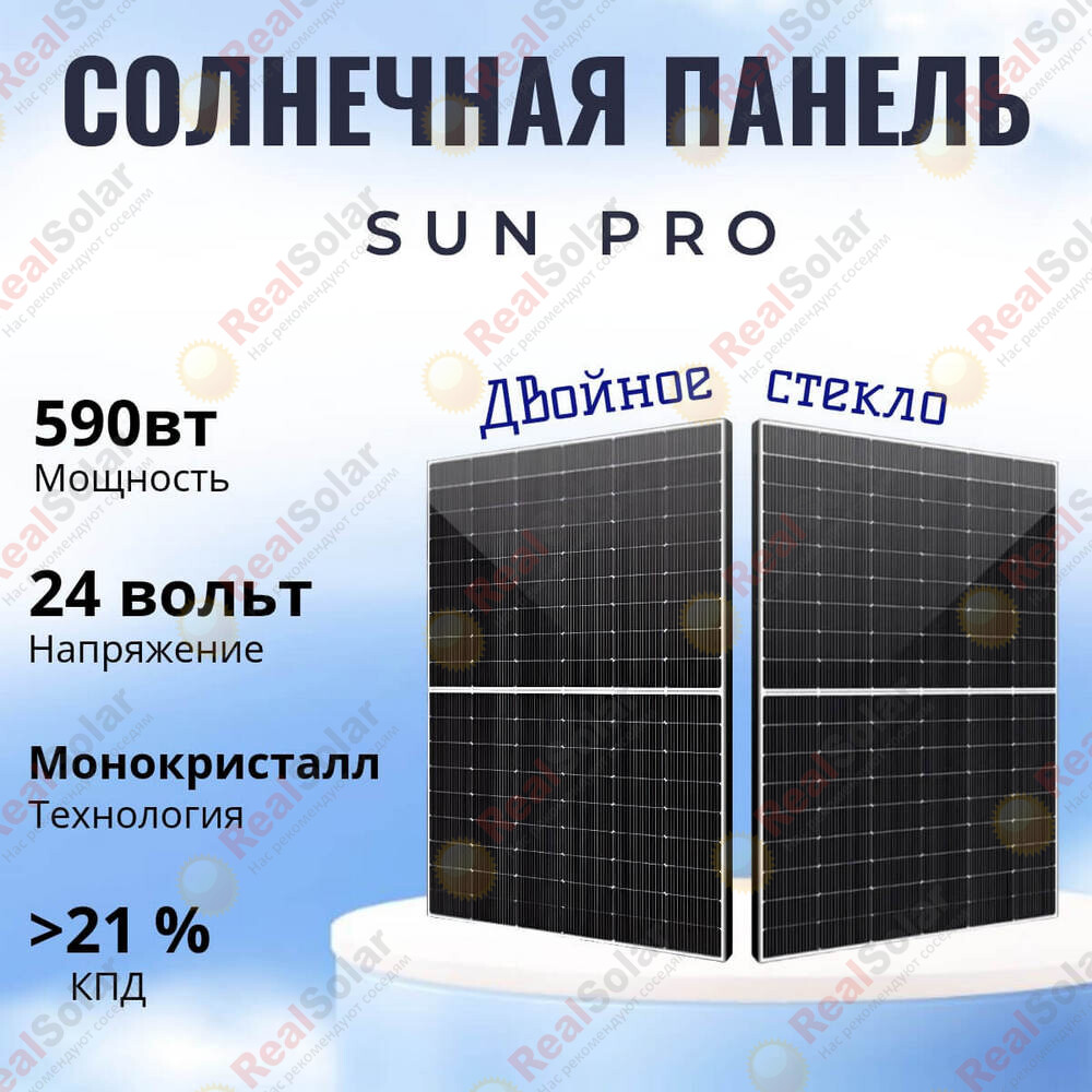 Солнечная панель Sunpro TOPCON М10 590W SPDG590-N144M10 это высокоэффективный модуль нового поколения с технологией TOPCon и двухсторонней генерацией энергии - генерирует электроэнергию с фронтальной и задней строны панели, если на на нее падает рассеяный или отраженный свет.