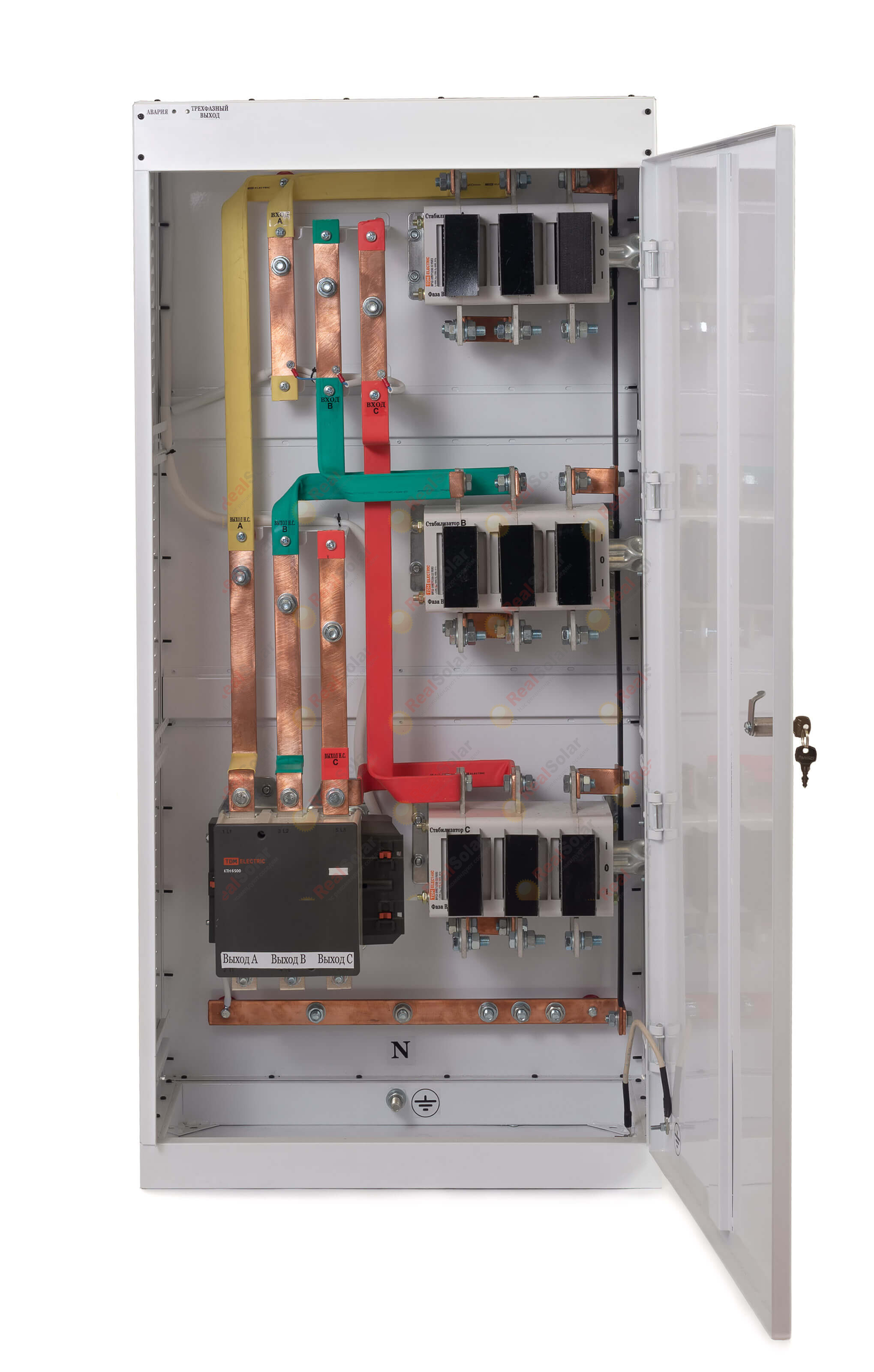 Модуль трехфазный внешнего байпаса и синхронизации фаз БКС 75, предназначен для объединения трех любых однофазных стабилизаторов напряжения Энерготех мощностью до 75 кВА, для работы в трехфазном режиме. Модуль БКС может быть использован без стабилизаторов напряжения, для организации защиты трехфазных нагрузок от неполнофазного режима.